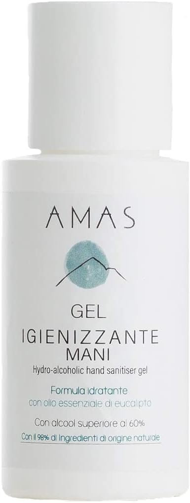 AMAS GEL Igienizzante Mani – 98% Origine Naturale- Idratante, Emolliente, Dermoprotettivo – Con Olio Essenziale di Eucalipto -100% Fatto a Mano in Italia – 50ml